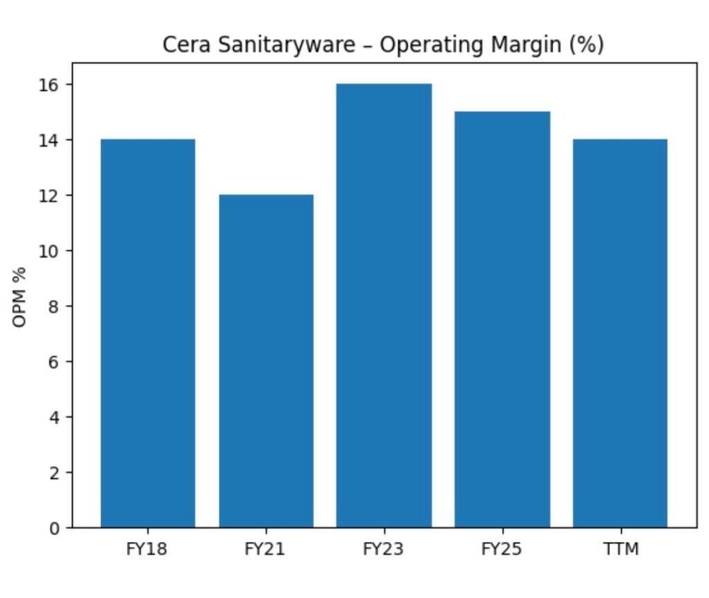 In the past, Cera operated at operating margins between 14 and 17 percent which indicated an efficient operation at a premium price. The new narrowing down of the margin raises concerns on the inflation of raw materials, competitiveness in offering discounts, or the increased cost of operations. Recovery of margin will be essential to maintain the ratios of returns and valuation multiples.
